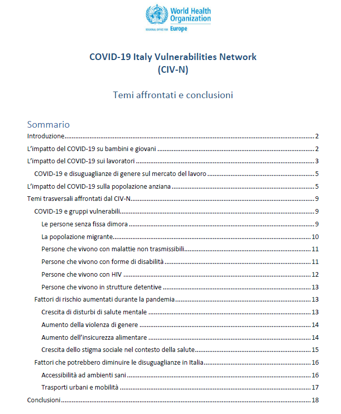 Istituito nel maggio 2020 dall’Ufficio regionale dell’OMS per l’Europa, il CIV-N (Covid Italy vulnerabilities – network) ha avuto lo scopo di valutare quale sia stato l’impatto del COVID-19 sugli anziani, sui vulnerabili e su coloro che vivono in condizioni di povertà in Italia, con lo scopo di aiutare i decisori politici ad individuare da una parte le azioni e le politiche attuate prima e durante la crisi che potrebbero aver aumentato preesistenti disuguaglianze di salute e averne innescato di nuove e dall’altra, le misure che se adottate, avrebbero tutelato la salute dei gruppi più vulnerabili della popolazione.