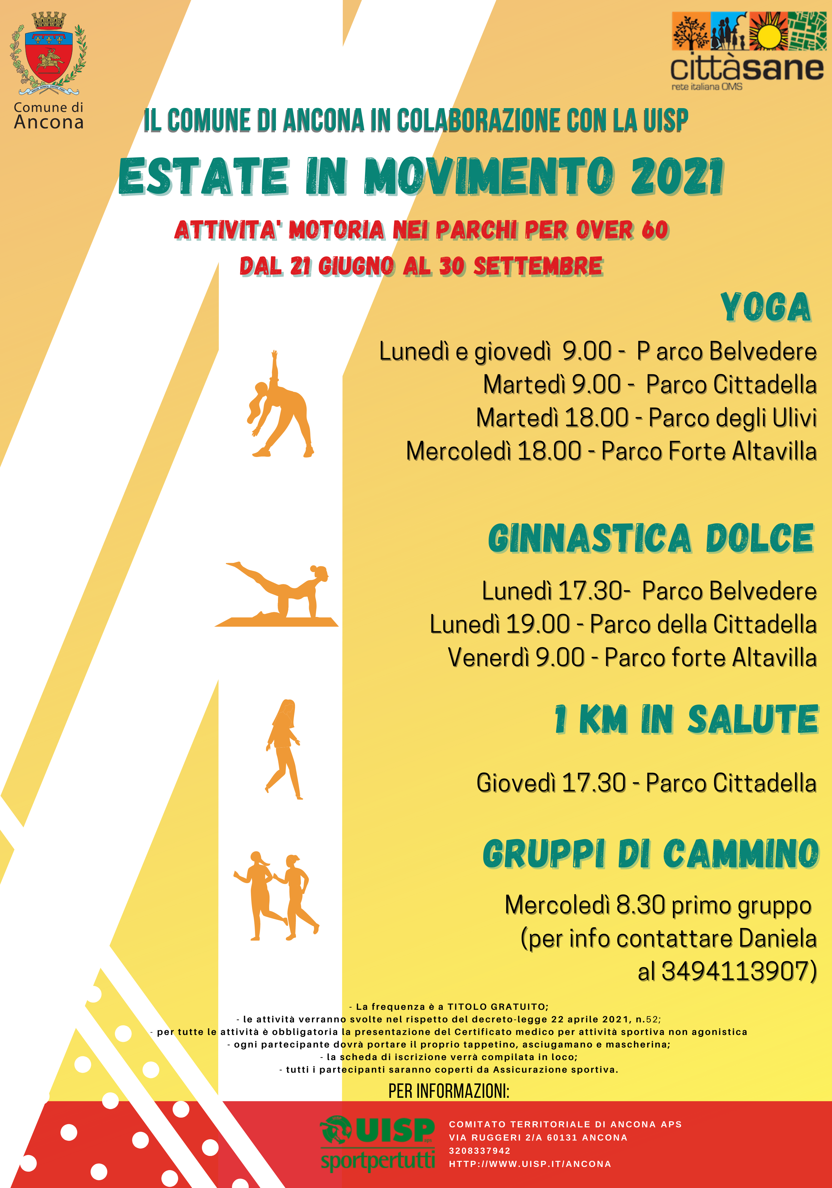 Nell’ambito delle iniziative per la promozione di corretti stili di vita e città amica degli anziani, anche quest’anno riparte ‘Estate in movimento’ ciclo di attività svolte all’aperto per over 60. Yoga, Ginnastica dolce, 1 un km in salute e i Gruppi di cammino sono le proposte che verranno svolte nei principali parchi cittadini di Ancona insieme agli istruttori Uisp.